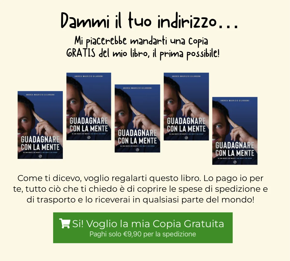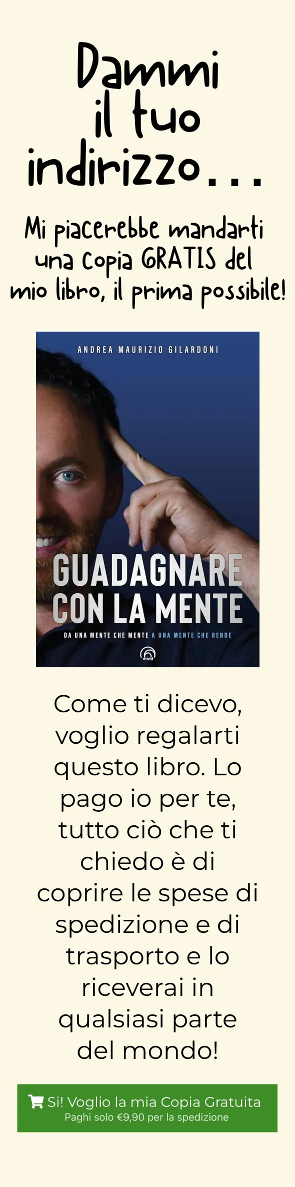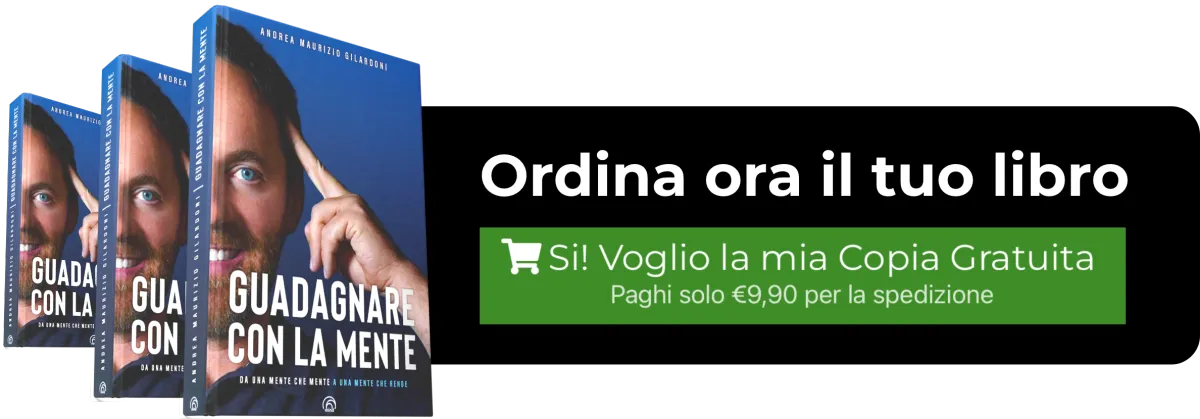 Io ti regalo il mio libro di 256 pagine “Guadagnare Con La Mente” (in vendita a €19 da qualsiasi altra parte), e sarà tuo per sempre GRATIS.